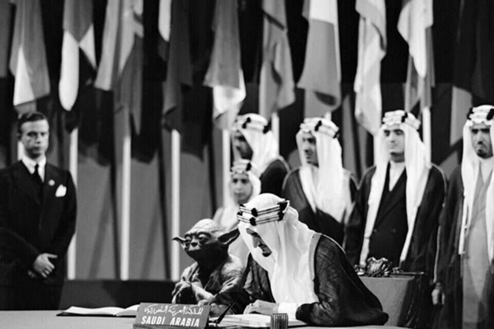 מה שהפתיע את תלמידי התיכון הסעודיים היתה העובדה כי בתמונה שהוצגה ספר בלימוד, לצידו של שר החוץ דאז, פייסל, ישב במעמד החתימה גם יודה, מסטר הג'דיי הנודע ממותג הקולנוע הפופולארי, "מלחמת הכוכבים" שעל פי האגדות הלך לעולמו בגיל 800 בערך.
