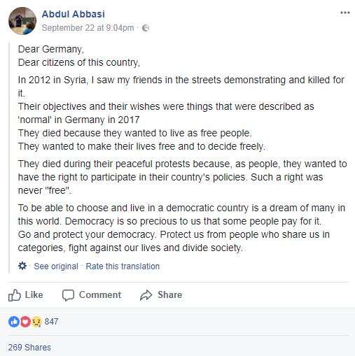 מרטין שולץ, מנהיג המפלגה הסוציאל דמוקרטית הגרמנית ומועמד לתפקיד קנצלר, פרסם הבוקר (ראשון) הודעה שקיבל בפייסבוק ממהגר סורי שקרא לגרמנים לצאת ולהצביע בבחירות הנערכות היום. במכתב הפתוח לאזרחי גרמניה שפרסם שולץ, כתב עבדול עבאסי, צעיר שהיגר לגרמניה בעקבות מלחמת האזרחים בסוריה: "המטרה שלהם הייתה להשיג דברים שנראים מובנים מאליהם בגרמניה של שנת 2017", כשהוא מתכוון לחבריו שנהרגו במהלך הפגנות נגד המשטר בשנת 2012 בסוריה, "הם מתו כי ביקשו לחיות כבני אדם חופשיים, הם רצו להשתתף במשחק הדמוקרטי במדינתם".