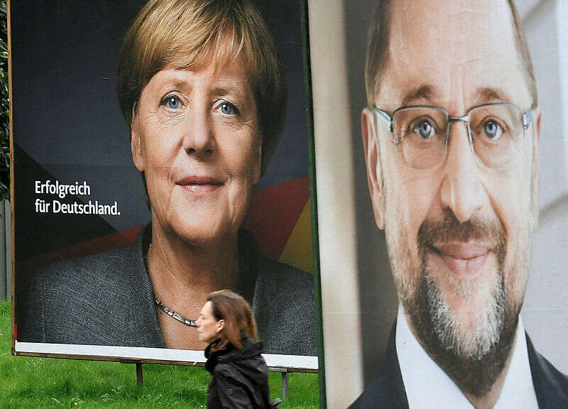 כרזות של מרטין שולץ מול אנגלה מרקל // צילום: רויטרס