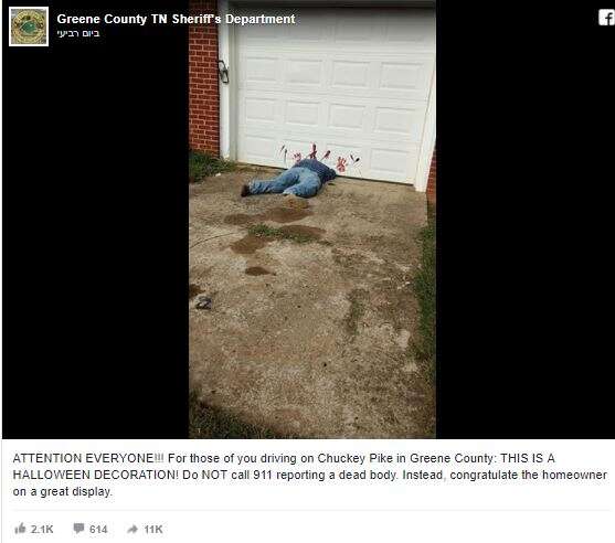 המשטרה המקומית שיתפה את התמונה בפייסבוק זמן קצר לאחר מכן, והזהירה את התושבים: "לא להתקשר 911 ולדווח על גופה". "כמו כן, אנחנו מברכים את בעל הבית על התצוגה הגדולה", הוסיפו במשטרה.