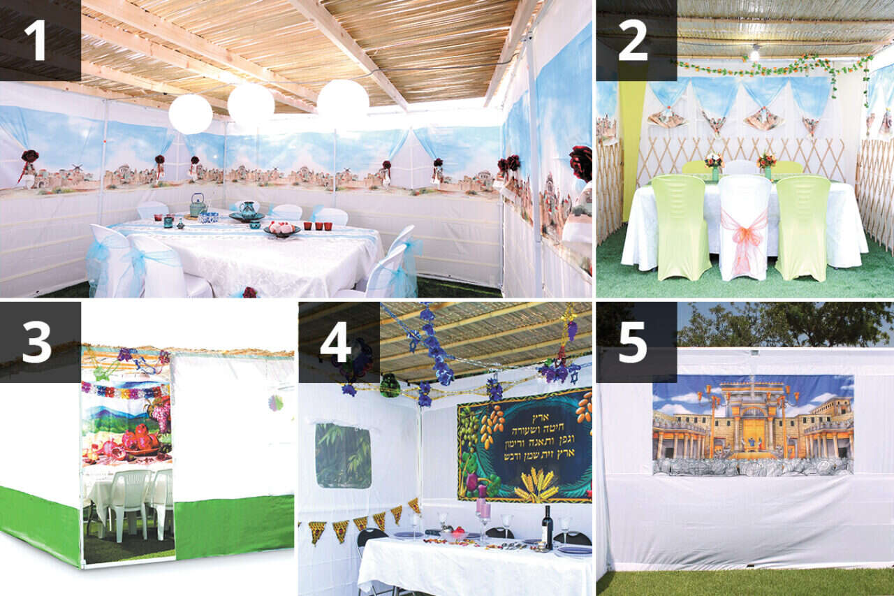 בתמונה: 1. בד הכותנה האיטראקטיבית של סוכות נחלים, 2. סוכות ירושלים, 3. סוכה של אייס, 4. סוכה של הום סנטר, 5. דגם "חומות ירושלים" של סוכות ירושלים