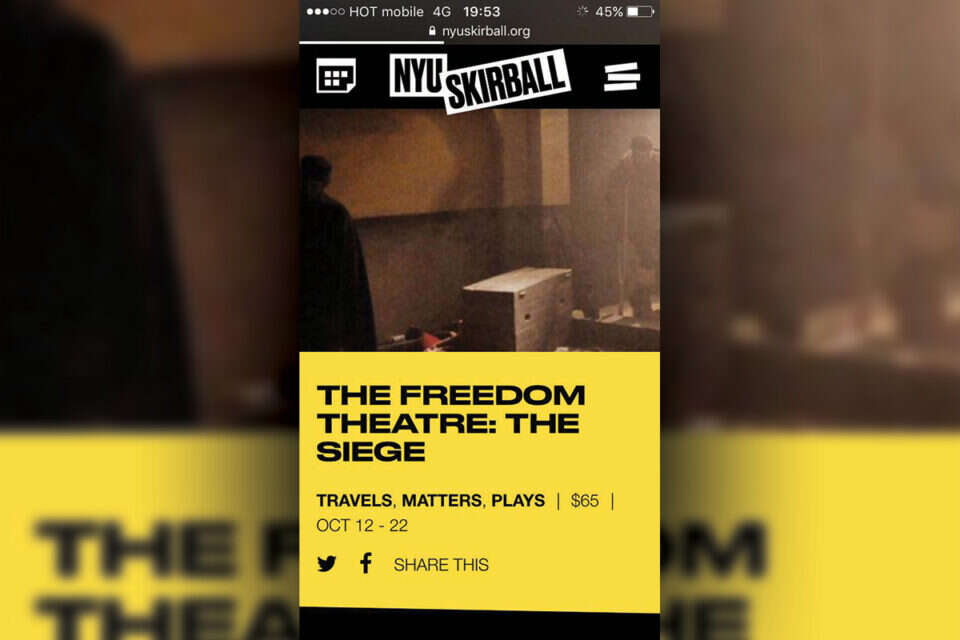 שוב, הצגה אנטי־ישראלית עתידה להיות מוצגת באחת האוניברסיטאות החשובות בעולם - NYU בניו יורק. מרכז סקירבול לאמנויות הבמה, השייך לקמפוס המכובד, יארח במשך 10 ימים את ההצגה "המצור" של תיאטרון "החופש", ותמורת 65 דולר לכרטיס יוכלו הסטודטים לצפות בגרסה הפלשתינית לאירועי כנסיית חג המולד במבצע חומת מגן.