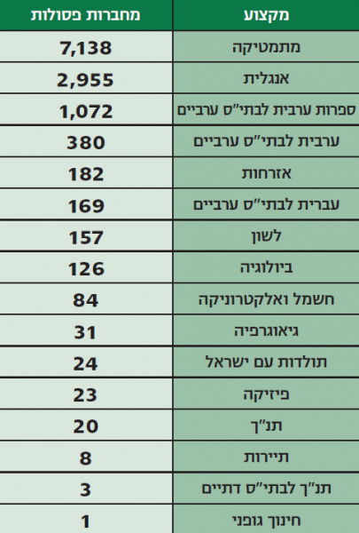 הנתונים הבלעדיים שמתפרסמים חושפים גם את המקצועות שבהם התלמידים, ככל הנראה, מעתיקים הכי הרבה. כך, למשל, בתשע"ו נפסלו 7,138 מחברות בחינה במתמטיקה, ו־2,955 מחברות באנגלית. כמו כן, נפסלו 182 מחברות באזרחות, 157 מחברות בלשון ואפילו בחינת בגרות אחת בחינוך גופני. בנתונים בולטת תופעת העתקות במגזר הערבי, שבמסגרתה נפסלו 108 מחברות בהיסטוריה לבתי הספר הערבי, 1,072 מחברות בספרות לבתי הספר הערביים, 380 מחברות בערבית לבתי ספר ערביים ו־169 מחברות בעברית לבתי ספר ערביים.