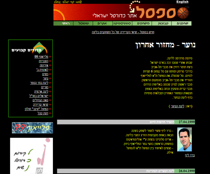 היו אלה ימי האינטרנט הראשונים ופרי, אז עוזר שדר בערוץ הספורט, גייס את מוטי גוסט, חברו לקורס תכנות בצבא, כדי ליילד את התינוק החדש על רקע שחור וגופן צהוב לא מזמינים במיוחד, שלימים יהפכו למזוהים מאוד. האתר ראה אור ב־6 באוקטובר 97', בשבוע שעבר לפני 20 שנה. הידיעה הראשונה בישרה לגולשים על חילוף זרים מרגש (או פחות) בגבעת שמואל: טראוויס מייז במקום שלי קלארק. "בקרוב תוכלו למצוא באתר את הסטטיסטיקות של מייז משנים קודמות", הבטיחו. וקיימו.