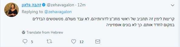 יו"ר מרצ זהבה גלאון ביקרה את הבתטאויותיו של גבאי ואמרה: "ראשי מפלגת העבודה הקודמים שהתנחפו למתנחלים לא נהנו מגלי אהדה פתאומיים של הימין - גבאי לא יהיה שונה. אילו 'פתרונות לא מחייבים פינוי ישובים'? התנחלויות בריבונות פלשתינית? גבאי שאל את הפלשתינים? חושדת שלא הם ולא המתנחלים יתלהבו. אין הסדר מדיני בלי פינוי התנחלויות, והסדר כזה הוא הנושא הקריטי ביותר שעומד בפני ישראל. אי אפשר להמשיך לדבר עליו בסיסמאות עמומות ובקריצות. עם כל הכבוד לנסיונות לקרוץ לימין.