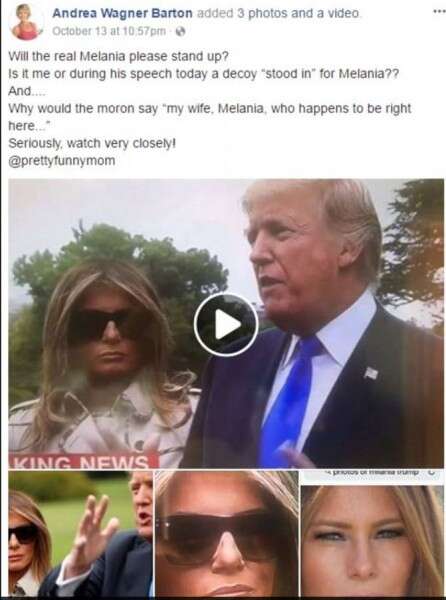 אנשי התיאוריה צפו בתמונה של טראמפ מיום שישי כאשר ביקר בפורטו ריקו עם רעייתו לאחר סופת ההוריקן. מלאניה נצפתה עם משקפי שמש השחורים ענקיים מאחורי הנשיא מהנהנת.