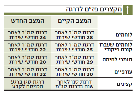 עוד הוחלט כי חיילים שעברו קורס פיקודי, כמו קורס מפקדי טנקים או קורס מ"כים, וקיבלו עד כה את דרגת הסמ"ר לאחר 25 חודשי שירות, יקבלו אותה החל מעכשיו לאחר 22 חודשי שירות. תומכי לחימה, שהיו מקבלים דרגת סמ"ר לאחר 29 חודשי שירות, יקבלו אותה כעת לאחר 28 חודשים, ואילו חיילים עורפיים שאינם לוחמים או תומכי לחימה, שקיבלו בעבר את הדרגה המעידה על פז"ם לאחר 32 חודשי שירות, יקבלו אותה כעת לאחר 30 חודשים, חודשיים בלבד לפני שחרורם מצה"ל.