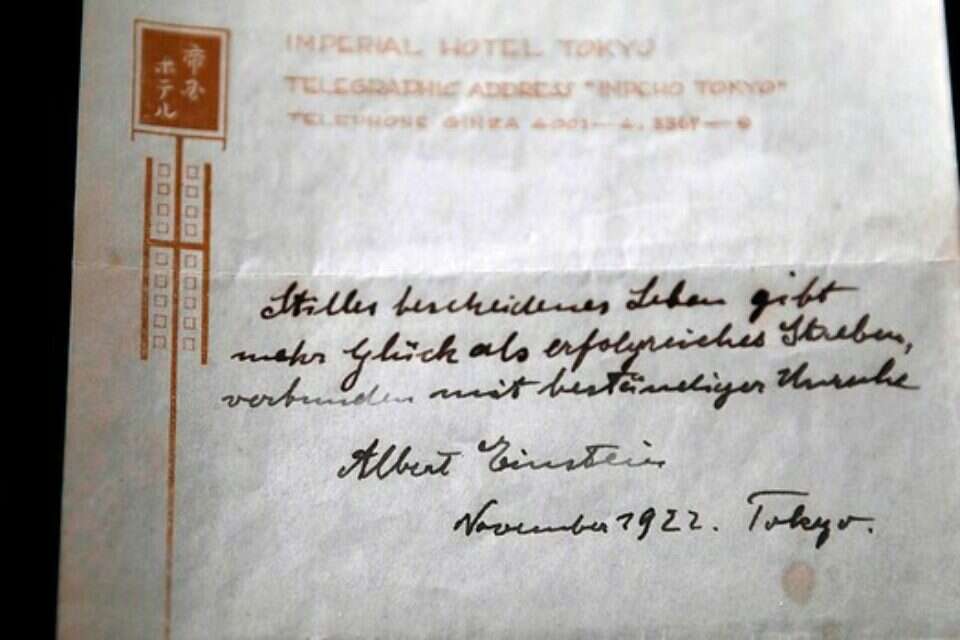 בפתק, שניתן לשליח שהגיע לחדרו במלון בטוקיו, כתב איינשטיין: "חיים שקטים וצנועים מביאים יותר אושר מאשר רדיפה אחרי הצלחה הכרוכה בחוסר מנוחה קבוע". איינשטיין מסר לשליח פתק נוסף ובו כתב: "במקום שיש רצון, יש דרך".