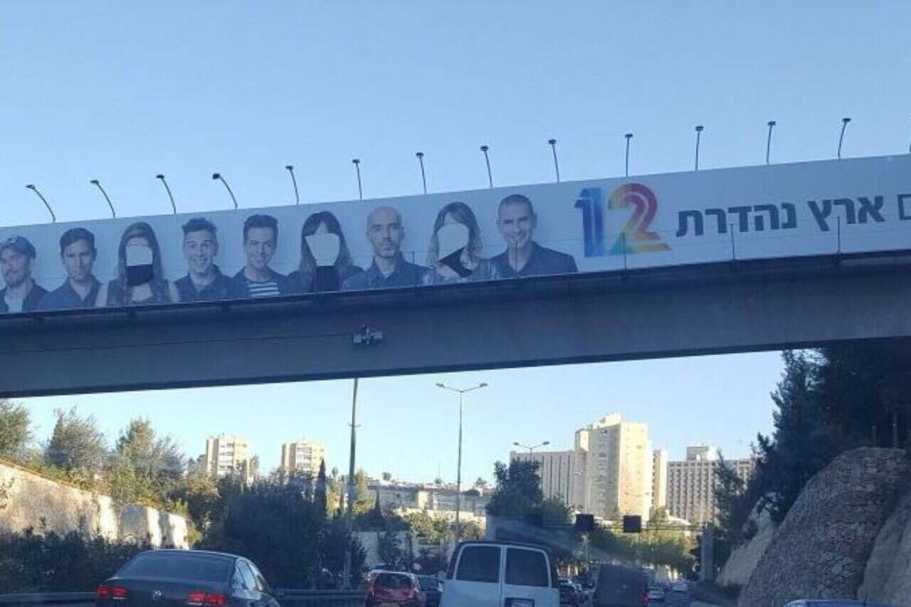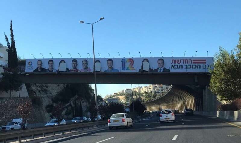 פרצופן של יונית לוי, רותם סלע וקרן פלס הוסר משלט חוצות בדרך בגין דרום // צילום: יואב הרשקוביץ