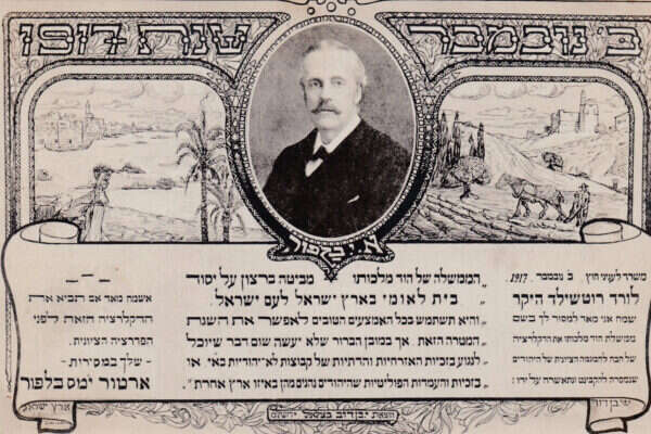 "כתב שחרור ניתן לנו", כתב על ההצהרה איתמר בן אב"י. נוסח ההצהרה ודיוקנו של בלפור, י.בן דב בצלאל (1918) // צילום: תערוכת האקדמיה // "כתב שחרור ניתן לנו", כתב על ההצהרה איתמר בן אב"י. נוסח ההצהרה ודיוקנו של בלפור, י.בן דב בצלאל (1918)