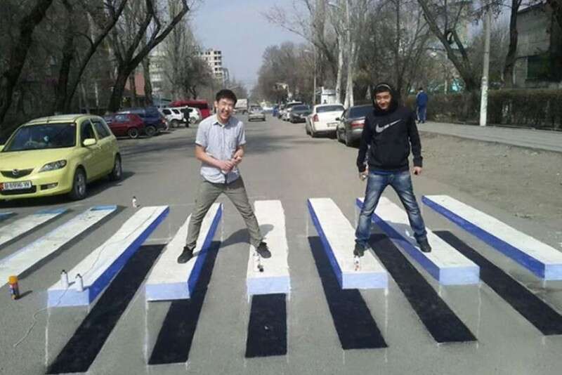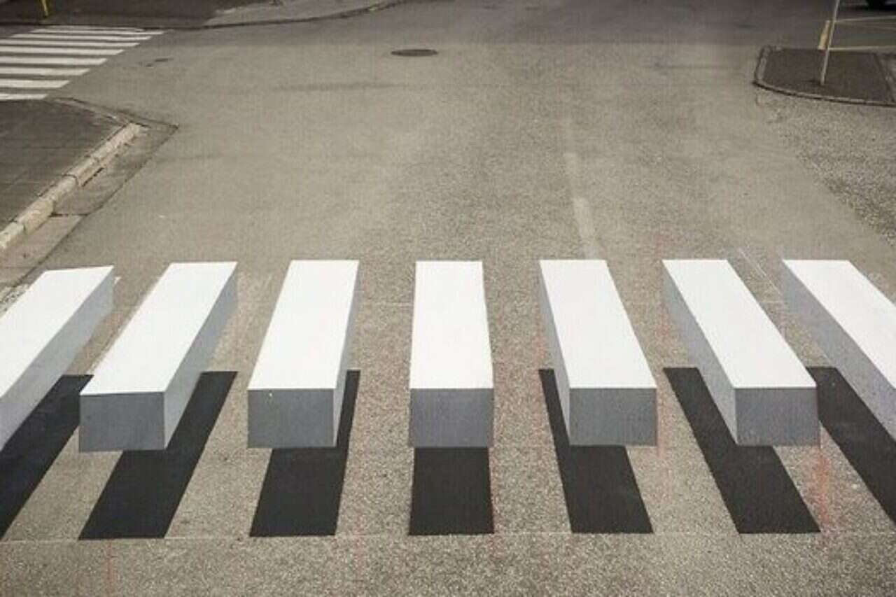 הפסים הלבנים של אחד המעברים בעיר נצבעו מחדש בצוaרה תלת ממדית, כך שהנהגים נהנים מאשליה אופטית מרהיבה והפסים נראים כמו עמודי בטון שמזדקרים מהאספלט. מלבד התחושה שהעיצוב החדש מעניק להולכי הרגל כאילו הם הולכים באוויר, הוא גם מושך את עיניהם של הנהגים המתקרבים למעבר החצייה.