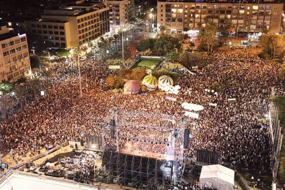 שילוב הידיים הזה נראה קצת מלאכותי. כיכר ה־400 אלף הולכת ונשחקת ככל שהשנים עוברות. חלק מהקהל בא בכלל לשמוע קצת מוזיקה. אני חוצה את הכיכר ממערב למזרח בקלות, בלי מתרסים ובלי יס"מניקים שלובי זרועות.