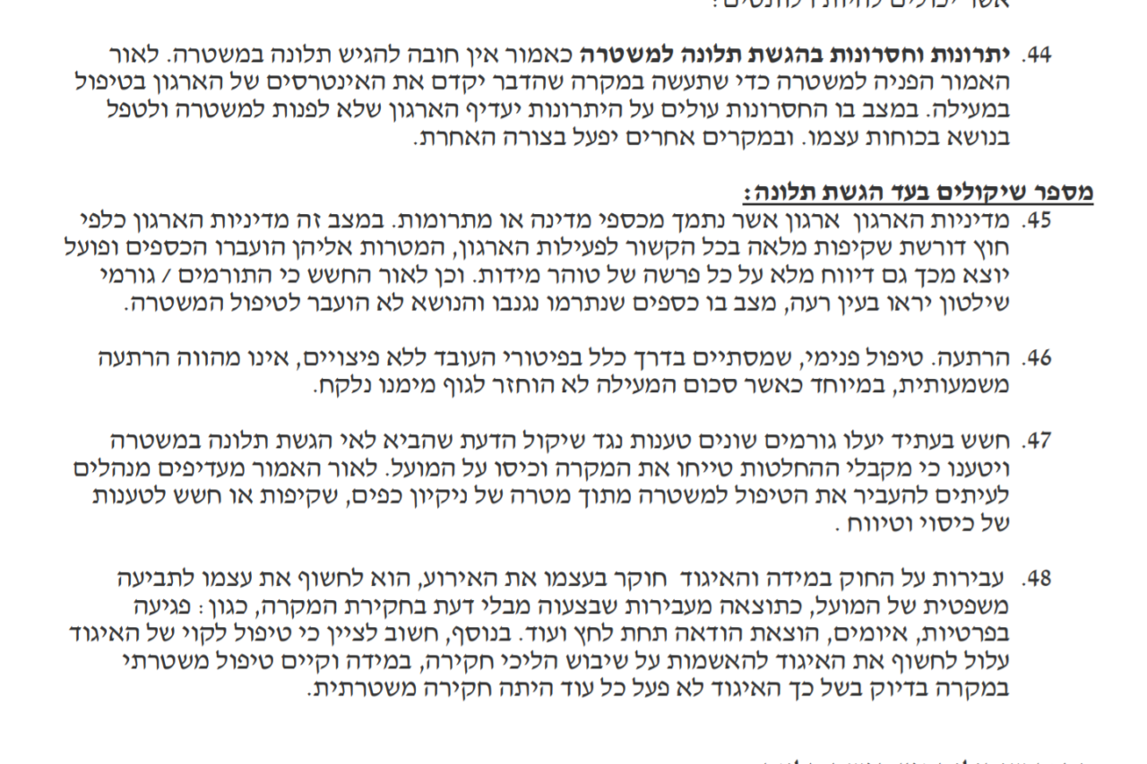 בדו"ח הפנימי שנכתב על ידי היועץ המשפטי של האיגוד והגיע בלעדית לידי "ישראל היום" נכתב בין השאר: "על פי החוק, אין חובה לפנות למשטרה", אך בהמשך נכתב: "מדיניות הארגון כלפי חוץ דורשת שקיפות מלאה בכל הקשור לפעילות הארגון, המטרות שאליהן הועברו הכספים ופועל יוצא מכך גם דיווח מלא על כל פרשה של טוהר מידות. וכן לאור החשש כי התורמים/גורמי שלטון יראו בעין רעה מצב שבו הכספים שנתרמו נגנבו והנושא לא הועבר לטיפול המשטרה. האיגוד, אם יחקור בעצמו, יכול להיות חשוף לתביעה מצד המועל".