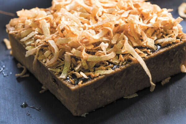 טארטלט ריבועי אישי במידות 8X8 ס"מ ובגובה 2 ס"מ, המורכב מ־3 מרקמים שונים שעובדים נהדר יחדיו - בצק פריך, גנאש שוקולד מריר ושבבי קוקוס מסוכרים וקריספיים. המתכון ל־6 יחידות.