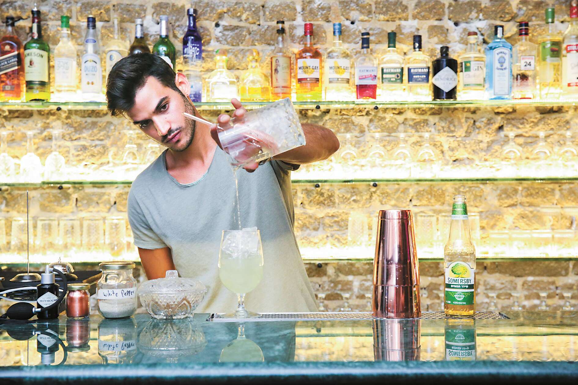 תחילת החורף הביאה אותי לחזור למשקה התפוחים ולבדוק מה עוד אפשר לעשות איתו. לצורך העניין ביצענו השתלטות על "פארוק בשוק - ג'ין אנד ג'וס", בר קוקטיילים שנפתח השנה בשוק הפשפשים ביפו, כדי להכין כמה קוקטיילים עם הסיידר של סומרסבי.