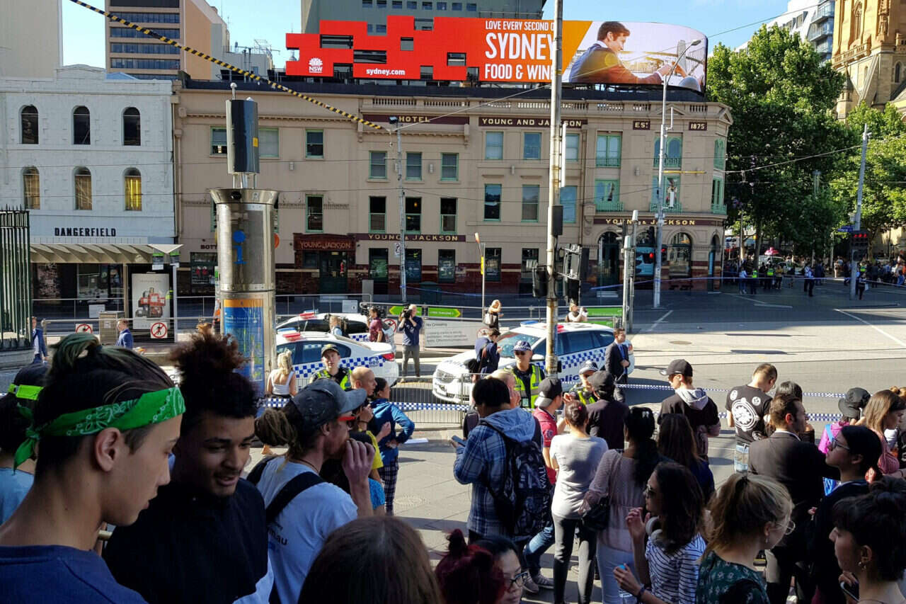 ג'יפ לבן התנגש בקבוצה צפופה של הולכי רגל סמוך לתחנת הרכבת הראשית בעיר  ברחוב פלינדרס. האירוע גרם לפאניקה במרכז העיר, לחסימה של רחובות ולתנועה ערה של כוחות המשטרה וההצלה ברחבי העיר.