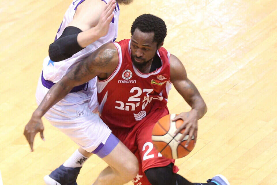 מאט הווארד מול שחקני הרצליה. הצטיין עם 14 נקודות אצל האדומים // צילום: עודד קרני
