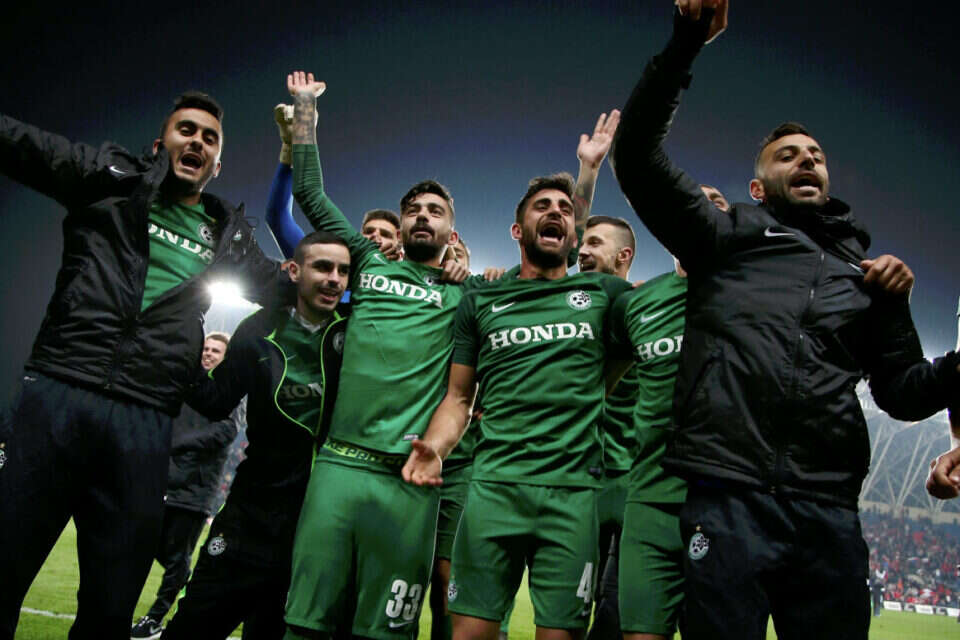 שחקני חיפה חוגגים. העפילו לאחר קרב עיקש לשלב הבא // צילום: אלן שיבר