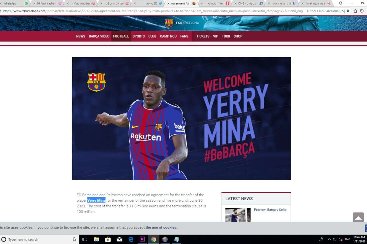 פחות משבוע אחרי שהחתימה את פיליפה קוטיניו, ברצלונה השלימה עסקה נוספת בחלון ההעברות של ינואר. יירי מינה, בלם קולומביאני בן 23, סיכם לחמש שנים וחצי אצל המוליכה הספרדית ויגיע תמורת כ־12 מיליון יורו מפלמייראס הברזילאית, כך הודיע המועדון הקטלאני.