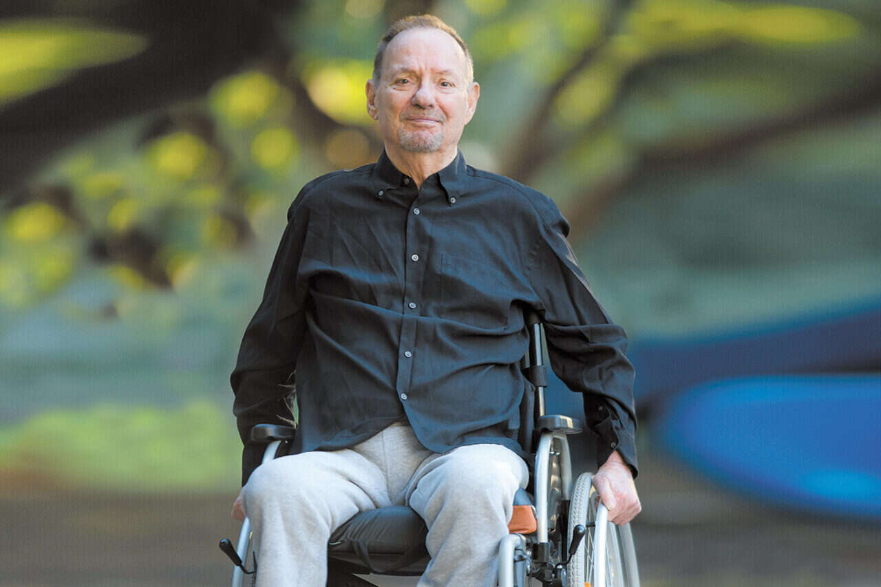 הוא ישוב מולי בכיסא הגלגלים, מכנס הטרנינג שלו מקופל מעל ברך ימין - המקום שבו נכרתה הרגל. על שולחן הסלון שמפריד בינינו מונחות קופסאות כדורים. תוך כדי לגימה מכוס מים, הוא משתף כי הוא סובל לפרקים מכאבי פנטום, ושזה יכול לפעמים לשגע. הוא כבר ללא המשקפיים והזקנקן המוכרים, ואני מחמיאה לו על כך שהוא נראה טוב. "הסוכר מאוזן", הוא עונה. "אני עושה פיזיותרפיה פעמיים בשבוע והקטנה שומרת עלי. כל זה מחזיק אותי", הוא אומר ומביט במבט אבהי באריס פיאל, המטפלת הפיליפינית שלו.