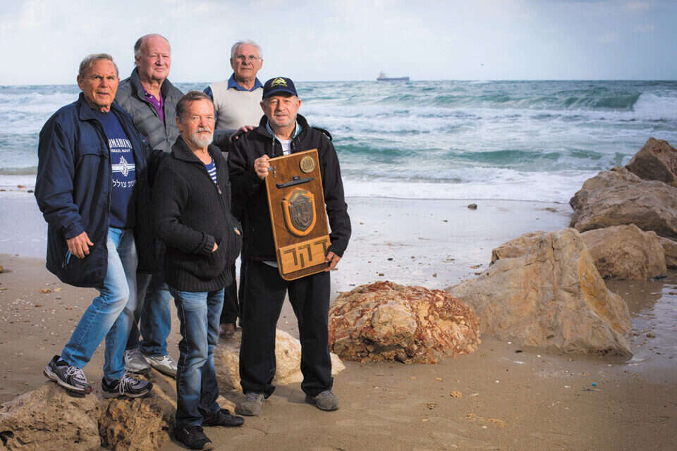 צילום: אריק סולטן // מימין: כרמל אברהם, יהושע שורש, מאיר טל, ישראל רוזן (שרול) ואברהם בן זאב (זבו), עם סמל הדקר. "לא רוצים לחשוב על דקות הטביעה"