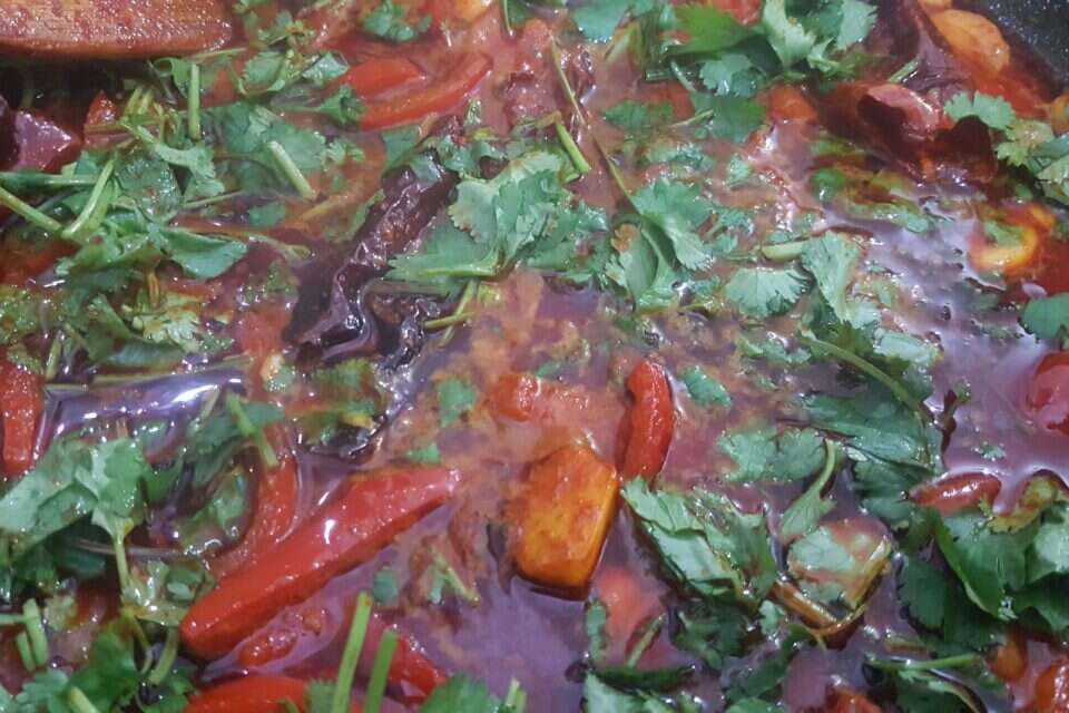 את הסיר הענק והשטוח באותו פונדק קטן החליף הפעם הסיר הקטן והצנוע שלי. נתתי לשום להוציא קצת טעמים בשמן ואליו הוספתי גמבה פרוסה, פפריקה מתוקה, וכף שטוחה של כמון. לאחר מכן נוספו גם מלח, פלפל שחור, מעט כורכום ובדיוק כשהכל נפתח והאדים מילאו את חלל החדר, הגיע הזמן להוסיף כוס מציר הבקר.