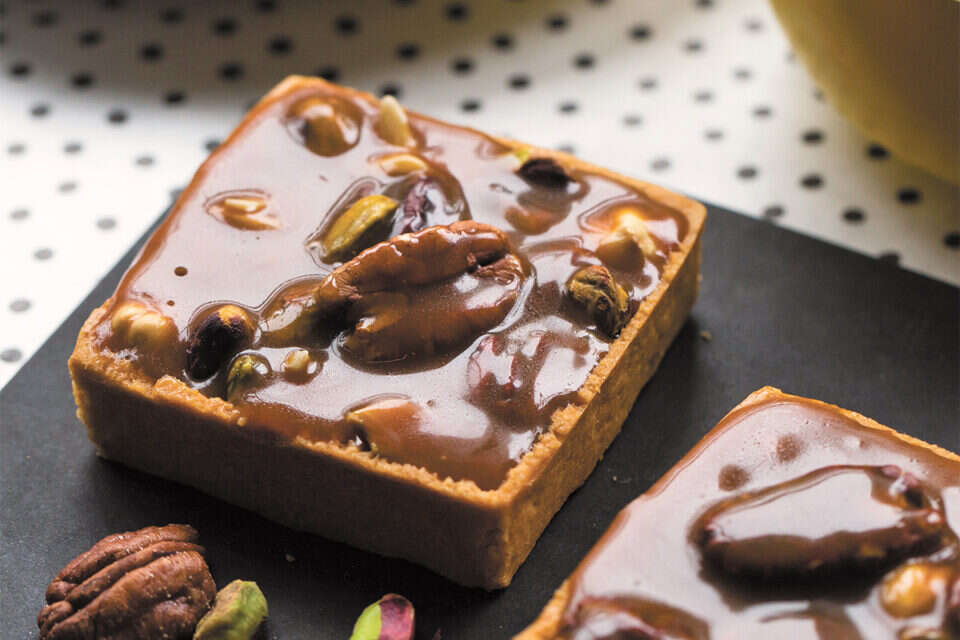 זהו טארט אישי מרובע בגודל 7.5X7.5 ס"מ, המורכב מבסיס של בצק פריך עם אגוזים קלויים וקרם טופי עשיר מעל. את סוג האגוזים אפשר לבחור, וחשוב מאוד לקלות אותם לפני.