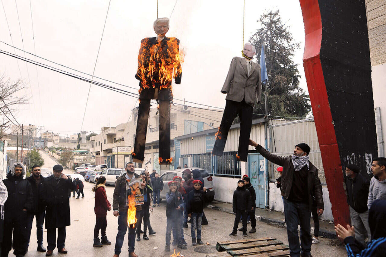 הפלשתינים מעלים את המתח מול ארה"ב: אחרי איחולי "יחרב ביתכ" של אבו מאזן בשבוע שעבר, היום (שבת) נתלו ונשרפו במחנה הפליטים עידא שמצפון לבית לחם בובות של נשיא ארה"ב דונלד טראמפ וסגנו מייק פנס.