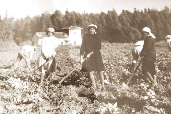 האחיות צאירי, שנות ה־20 של המאה הקודמת, מנכשות בשדה ליד בית המוטור // צילום: אתר תימני כנרת // האחיות צאירי, שנות ה־20 של המאה הקודמת, מנכשות בשדה ליד בית המוטור