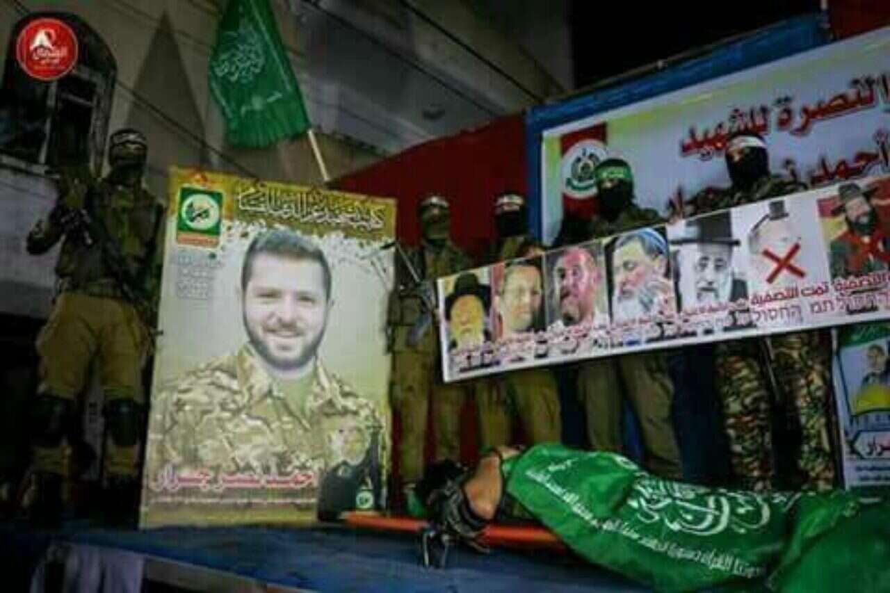 בתמונה נראה דיוקן גדול של אחמד ג'ראר, שפיקד על הרצח של הרב שבח סמוך לחוות גלעד, וחוסל אתמול בפשיטה של כוחות צה"ל על ביתו. לצד הדיוקן עומדים חמושים המחזיקים בכרזה גדולה בה נראיות תמונותיהם של הרב רז והרב בן גל כשאיקס אדום מצוייר על פניהם.