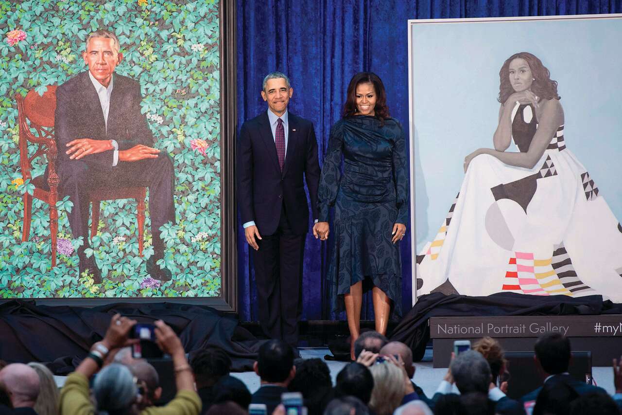 אתמול נחשפו הפורטרטים הרשמיים של הנשיא לשעבר ואשתו בגלריה הלאומית של גדולי האומה בוושינגטון • הצייר קהינה ווילי והציירת איימי שרלד, שאחראים ליצירות, ידועים בכך שהם מתכתבים ביצירותיהם עם סוגיית הגזע בארה"ב
