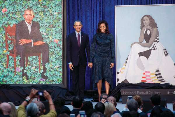 אתמול נחשפו הפורטרטים הרשמיים של הנשיא לשעבר ואשתו בגלריה הלאומית של גדולי האומה בוושינגטון • הצייר קהינה ווילי והציירת איימי שרלד, שאחראים ליצירות, ידועים בכך שהם מתכתבים ביצירותיהם עם סוגיית הגזע בארה"ב