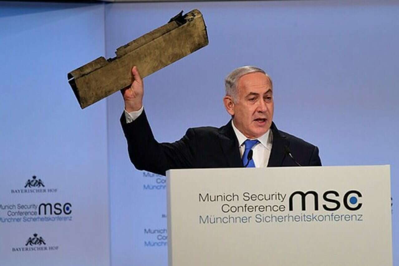 "שמענו את זריף. יש לו לשון חלקלקה. הוא משקר באלגנטיות. הכריזמה שלו הולכת לפניו. הוא טוען שאיראן אינה קיצונית. אם כל, איך תקרא למשטר כזה? למה איראן שולחת לוחמים ונשק לאזורים הללו. הוא מכחיש את מעורבות איראן בסוריה, את שליחת המל"ט. הנה חתיכה מהמל"ט", אמר נתניהו ושלף שבר מהמל"ט שהופל בשטח ישראל בשבת שעברה.