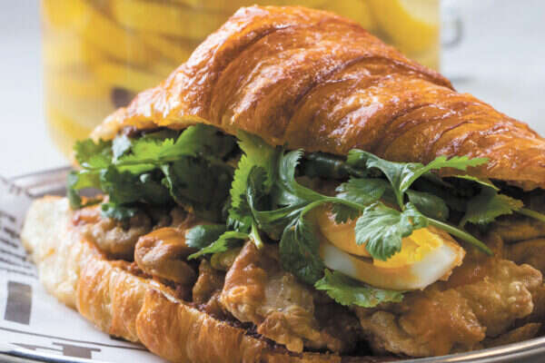 מרכיבים את המנה: מחממים את הקרואסונים וחותכים באמצע כך שיישארו מחוברים בצד אחד. מורחים על החלק התחתון של הקרואסון את טבחת הפלפלים, מניחים מעל את סלט תפוחי האדמה ומסדרים מעל 3 פרוסות מוח. מורחים את פרוסות המוח במשחת הלימון ומוסיפים מעט אריסה. חותכים את הביצים לרבעים, מניחים ביצים וכוסברה מעל המוחות, סוגרים את הקרואסון ומגישים.
