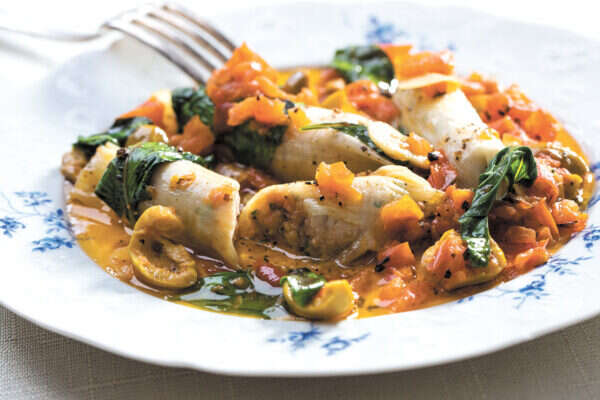 כרישה ממולאת בעוף ובורגול על רוטב עגבניות