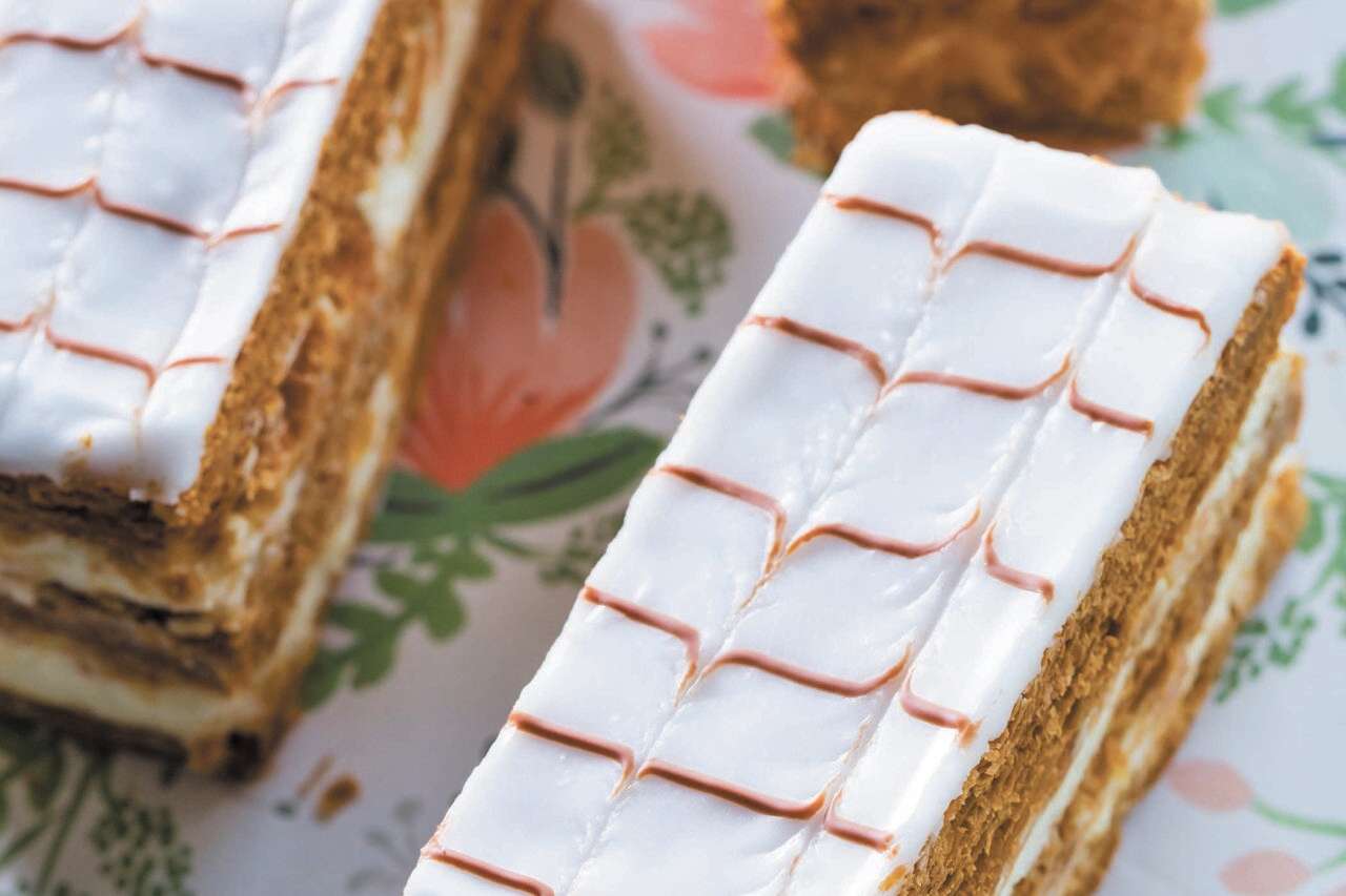 מרכיבים את העוגה: מניחים מלבן בצק עלים אפוי כבסיס לעוגה. מזלפים בצורת "לוח שחמט" משני הקרמים, מניחים מלבן נוסף של בצק עלים ועליו מזלפים כמו בשכבה הראשונה. מכסים בבצק עלים נוסף, מפדרים אבקת סוכר על מחצית העוגה בצורה אלכסונית ומגישים. אפשר לזלף על העוגות עיטור משאריות שני הקרמים.