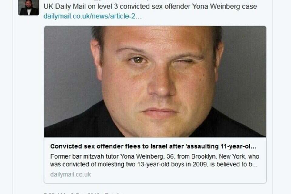 וינברג, שעלה לישראל בשנת 2014, לאחר שהורשע בעבירות מין חמורות בילדים, ריצה עונש מאסר בכלא, והוגדר על ידי רשויות החוק בארצות הברית כעבריין מין ברמת סיכון הגבוהה ביותר הקיימת בעבירות בתחום זה. כעת מסתבר, שלאחר שחרורו מהכלא פגע בילדים נוספים, וכאשר הבין שהחבל סביבו מתהדק, ברח ועלה לישראל. לאחרונה, רשויות החוק במדינת ניו יורק הכריזו עליו כעבריין מין מבוקש.