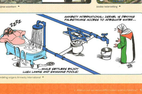 מעל לציור כתוב: "אמנסטי אינטרנשיונל: ישראל מונעת מהפלסטינים גישה מספקת למים... בעוד שהמתנחלים נהנים מדשאות פוריים ובריכות שחייה" (התמונה ככל הנראה של אמנסטי אינטרנשיונל). בעמוד בכללותו מופיעים הסברים לכאורה על המציאות של חלוקת המים בין מתנחלים לפלשתינים בישראל.