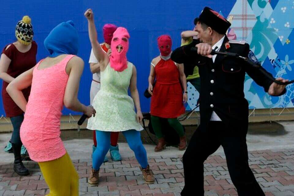 להקת "פוסי ריוט" באחת ממחאותיה המתוקשרות, בסוצ'י, רוסיה, 2014 // צילום: AP
