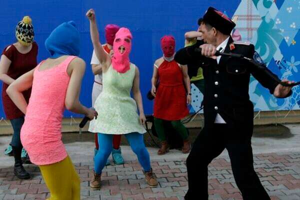 להקת "פוסי ריוט" באחת ממחאותיה המתוקשרות, בסוצ'י, רוסיה, 2014 // צילום: AP