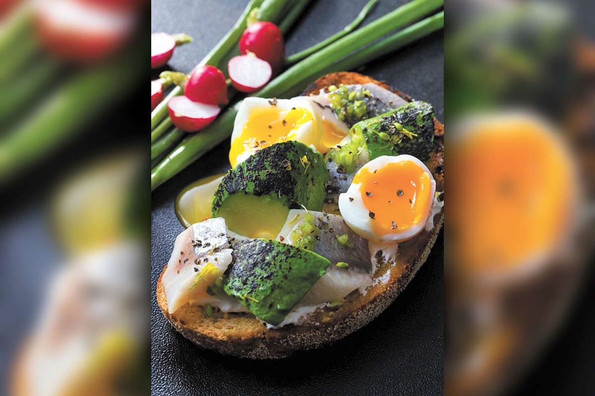 מרכיבים את המנה: מורחים בעדינות על כל פרוסת לחם חמאה איכותית ומעליה כף שמנת חמוצה. מניחים מעל אבוקדו, הרינג פרוס ו־1/2 ביצה ומפזרים צ'ילי ירוק, מלח ופלפל שחור. מטפטפים מעל את 2 כפות שמן הזית הנותרות ומגישים לצד צנוניות ובצל ירוק.