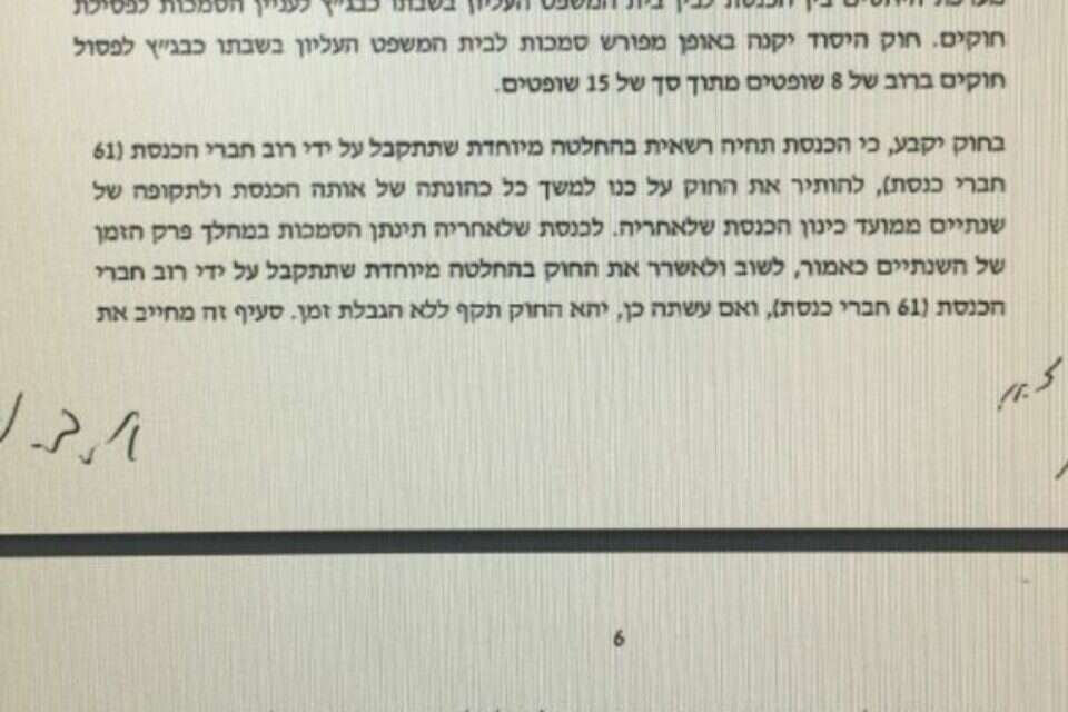 עוד נכתב במסמך כי "בחוק יקבע, כי הכנסת תהיה רשאית בהחלטה מיוחדת שתתקבל על ידי רוב חברי הכנסת (61 חברי כנסת), להותיר את החוק על כנו למשך כל כהונתה של אותה הכנסת ולתקופה של שנתיים ממועד כינון הכנסת שלאחריה. לכנסת שלאחריה תינתן הסמכות במהלך פרק הזמן של השנתיים כאמור, לשוב ולאשרר את החוק בהחלטה מיוחדת שתתקבל על ידי רוב חברי הכנסת (61 חברי כנסת) ואם עשתה כן, יהא החוק תקף ללא הגבלת זמן. סעיף זה מחייב את שני הצדדים להסכם ושתי הסיעות מתחייבות לפעול על מנת שהתיקון יקבל את הרוב הנדרש להליך החקיקה בכנסת".