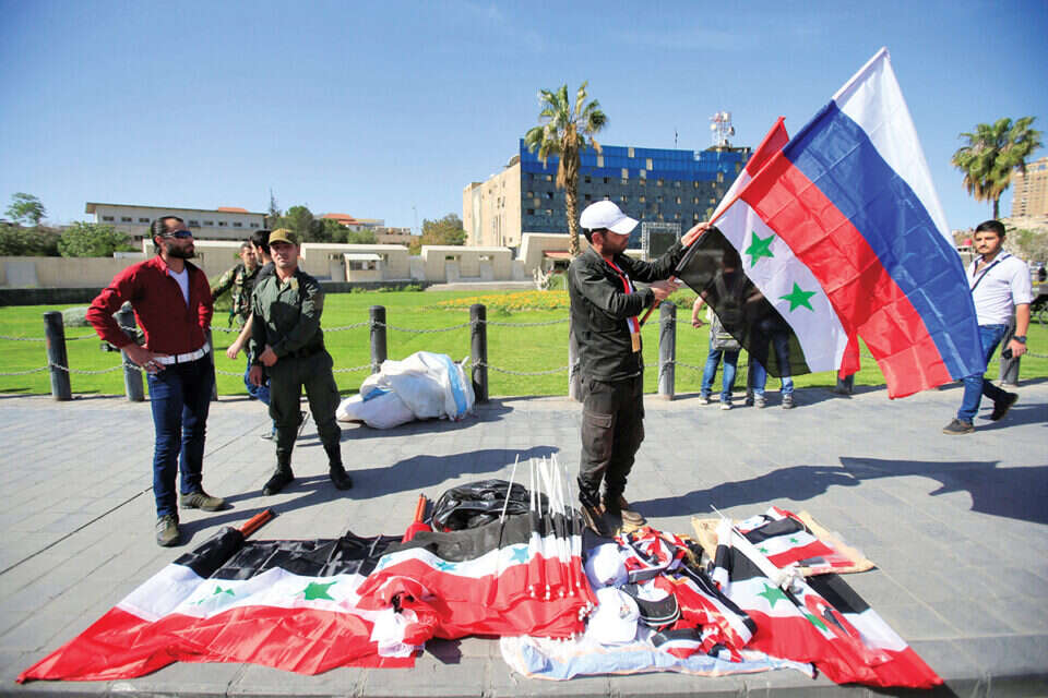 הידרדרות מהירה. מכירת דגלי סוריה ורוסיה בדמשק בשבוע שעבר // צילום: רויטרס // הידרדרות מהירה. מכירת דגלי סוריה ורוסיה בדמשק בשבוע שעבר