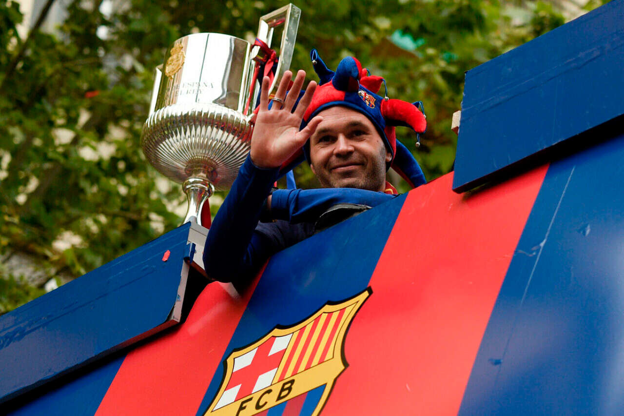 אינייסטה חוגג על אוטובוס השחקנים, אתמול ברחובות ברצלונה // צילום: אי-פי