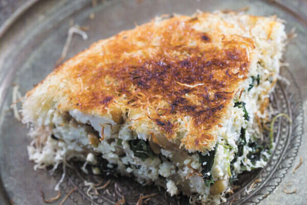 במתכון זה מכינה אסטלה גרסה מלוחה לקינוח הכנאפה המתוק והאהוב, ומגישה כאן כנאפה עם גֶבן - מוצק שנוצר מחלב. על מנת לא להסתיר את טעמו העדין של הגבן, היא הוסיפה לו רק מעט צמחי תבלין, ושערות הקדאיף המטוגנות מוסיפות לו עדינות מתפצפצת. "ולגבי כמות החמאה במתכון", אומרת אסטלה, "אני קצת חסכתי, למרות שתלמידה ערבייה לימדה אותי שכשעושים כנאפה, לא סופרים את כמות החמאה. אז אתם יכולים גם לחטוא ולהוסיף עוד קצת בטיגון". המתכון למחבת בקוטר 20 ס"מ.