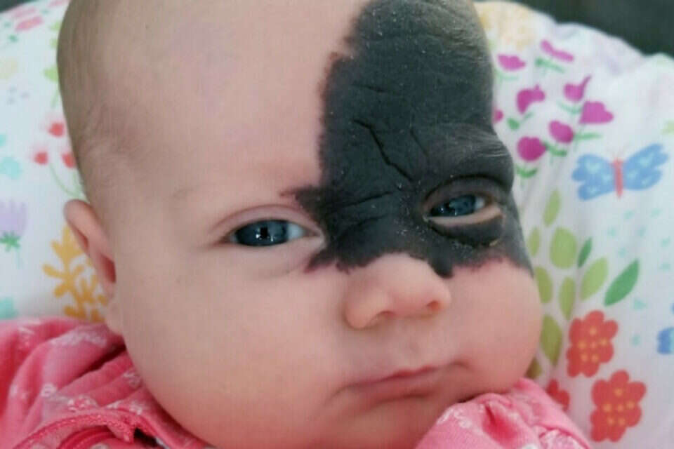 כשהגיחה התינוקת, שזכתה לשם נטלי, לאוויר העולם, הופתעו כל הנוכחים בחדר הלידה לגלות שעל כשליש מפניה מרוח כתם לידה שחור. כתם הלידה, שזכה לשם "המסכה של בטמן" בשל הדמיון למסכה של האביר האפל, בולט למרחקים, והוריה היו בפאניקה: "חשבתי שזה משהו שעשיתי לה במהלך הלידה, מכה שהיא חטפה או נזק מסוג אחר", סיפרה לייסי.