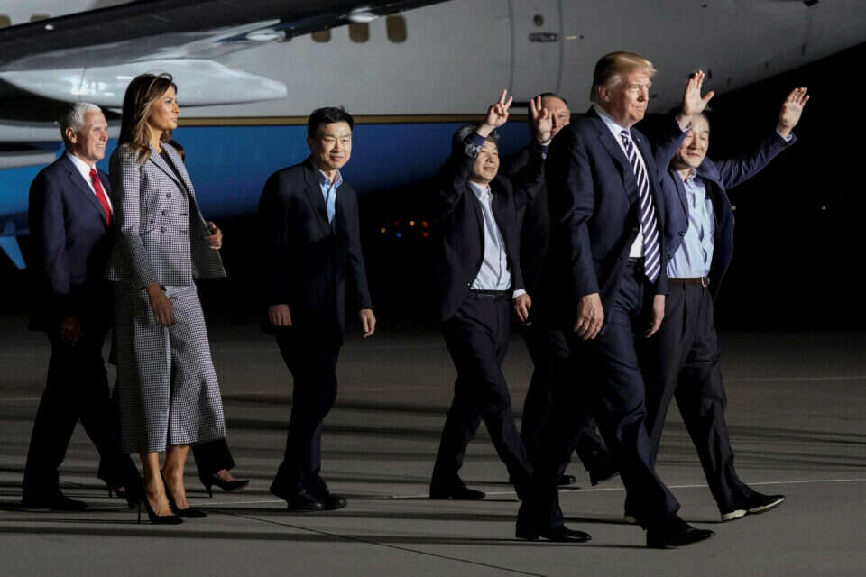 נשיא ארצו תהברית דונלד טראמפ נפגש אתמול עם שלושה אזרחי םאמריקנים ששוחררו מהכלא הצפון קוריאני בשדה התעופה הצבאי אנדרוז סמוך לבירה וושינגטון.