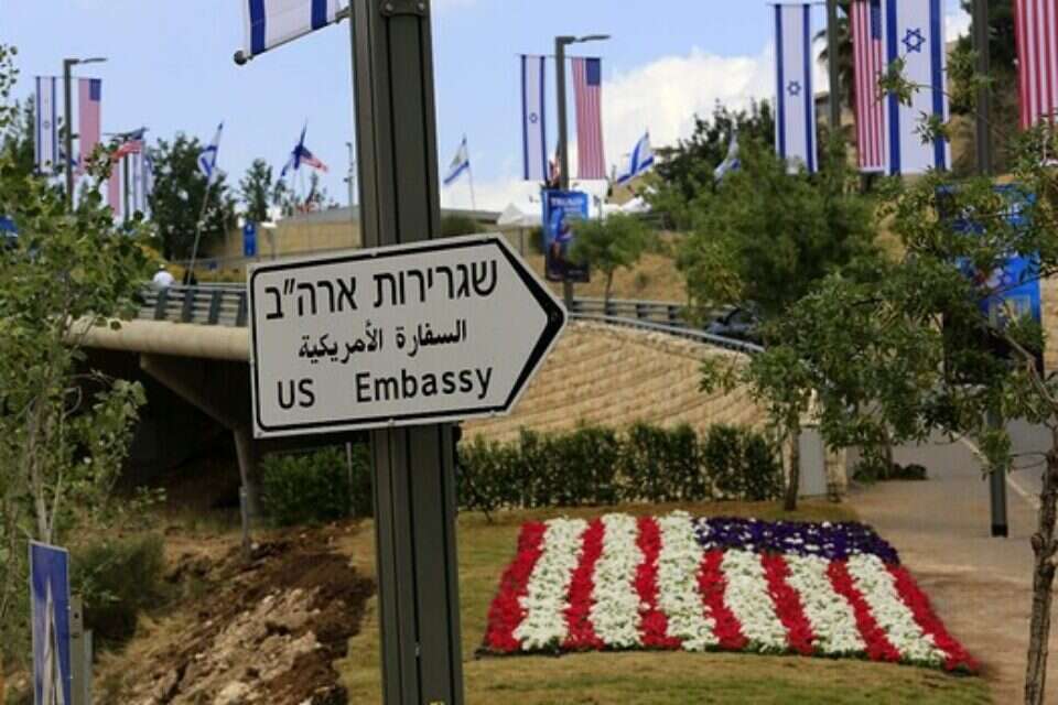 גשר המיתרים בכניסה לירושלים יואר בצבעי דגל ארה"ב, ובכביש המוביל אל השגרירות האמריקנית בבירה נתלו דגלי ארה"ב וישראל וגם נשתלו פרחים, בצבעי אדום, לבן וכחול, היוצרים את דגל ארה"ב.