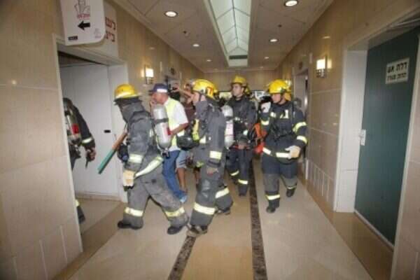 Large-scale exercise in heart of Tel Aviv simulates fire on 11th floor of central office block, near major hospital, bringing together all emergency services • Nearby cities of Bat Yam and Holon simulate rocket attack and evacuation of wounded to stadium.
