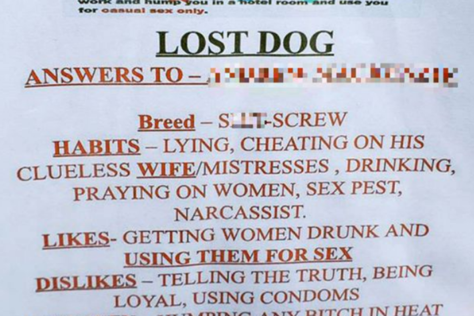 כך או אחרת, אין זו הפעם הראשונה בה מתבצע בבריטניה סוג של סיכול ממוקד נגד גבר בוגדני. לפני שנתיים פורסמה כרזה דומה בלונדון שבה מאהבת זועמת הוקיעה את בן זוגה ככלב בוגדני שאבד.